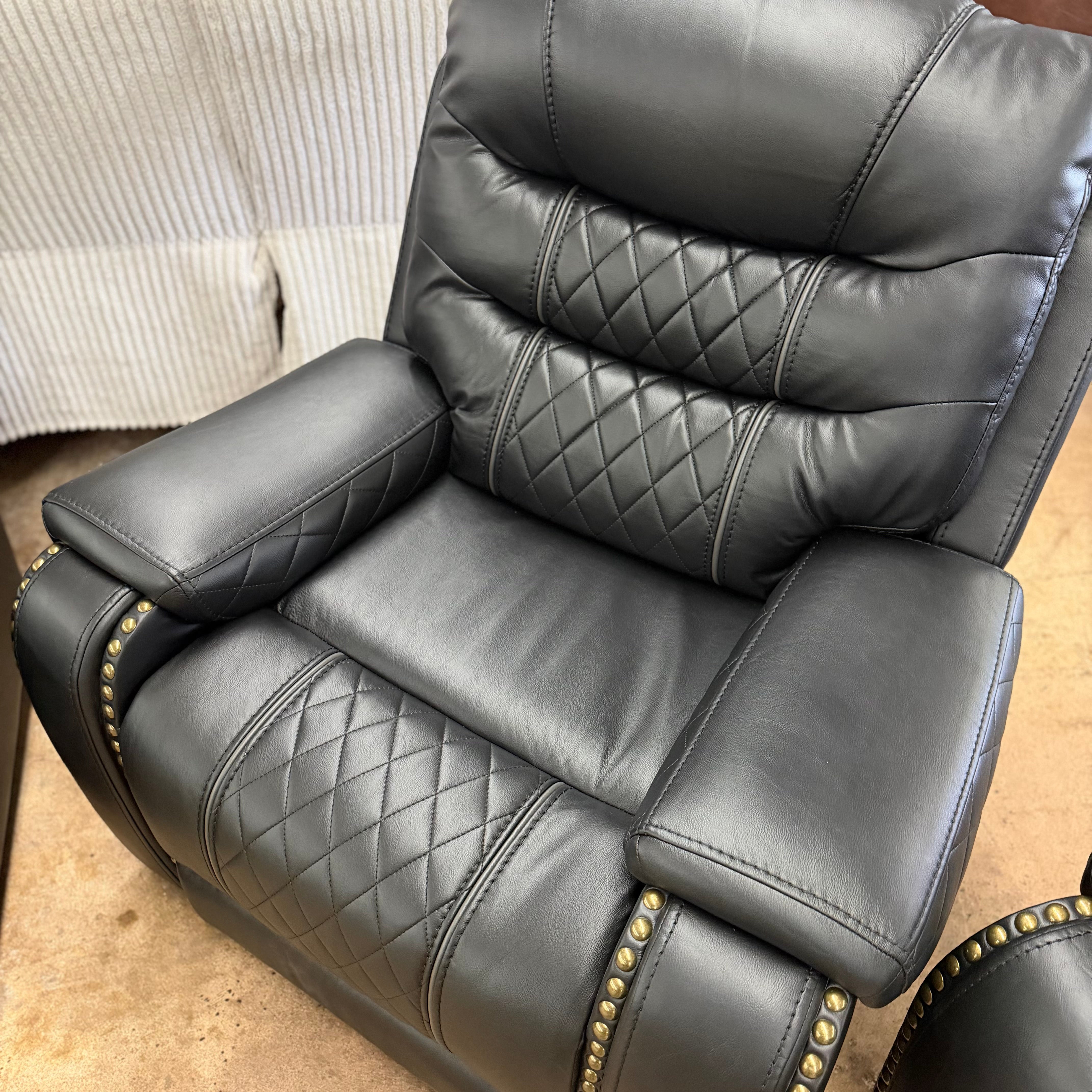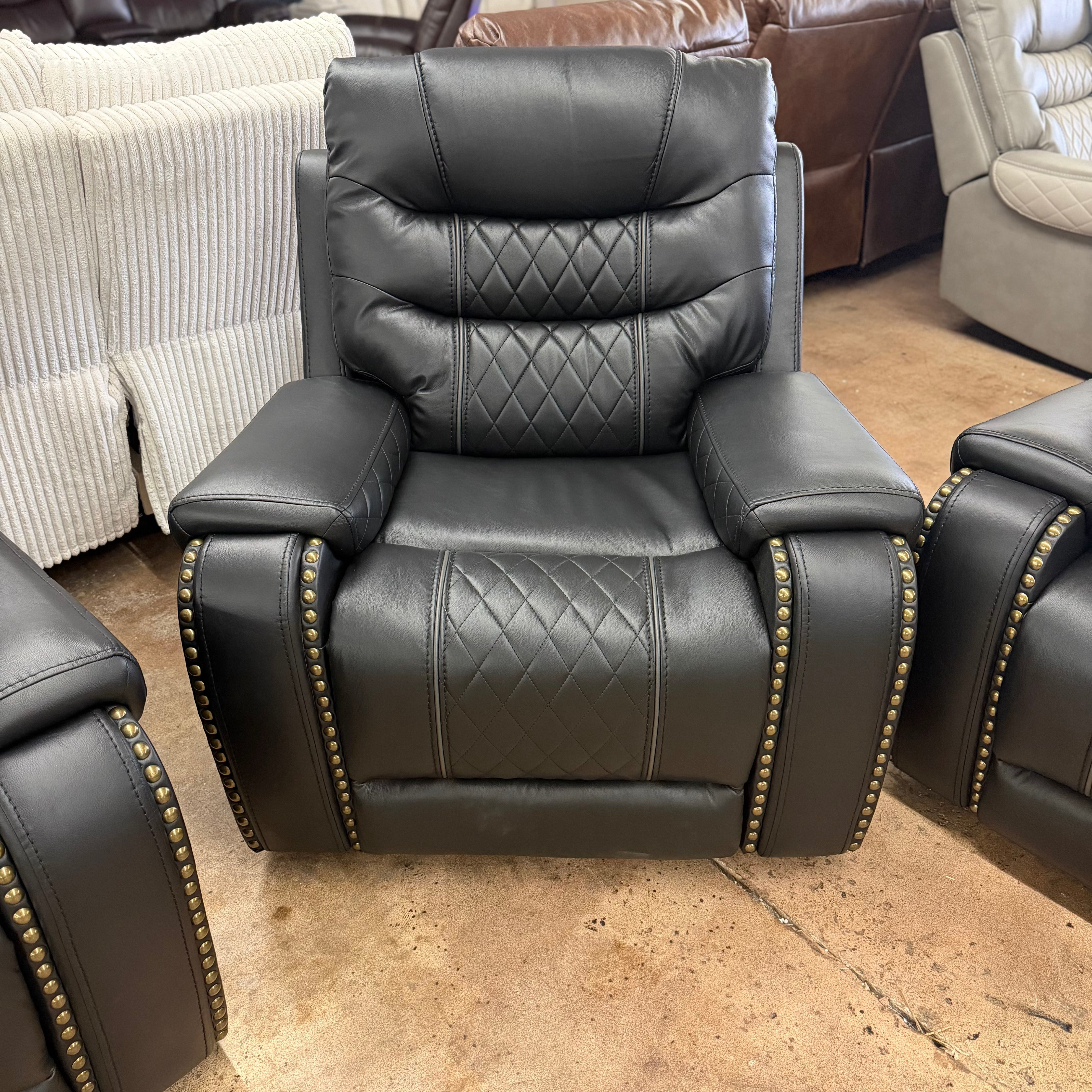 This Starwood Rocker Recliner is upholstered in a beautiful black leather air match material (breathable 100% polyurethane with the feel and appearance of leather-like). A matching reclining loveseat and sofa are available.