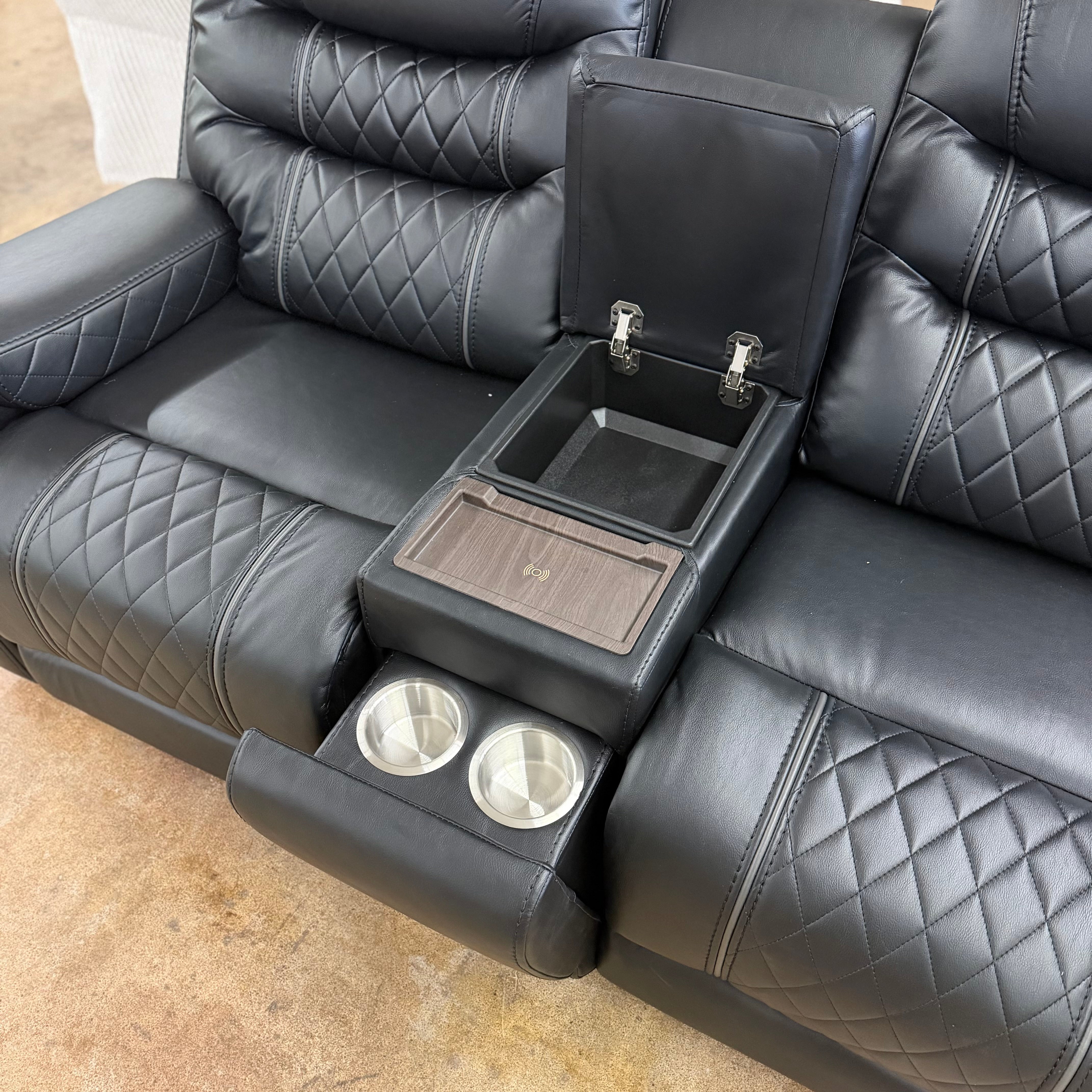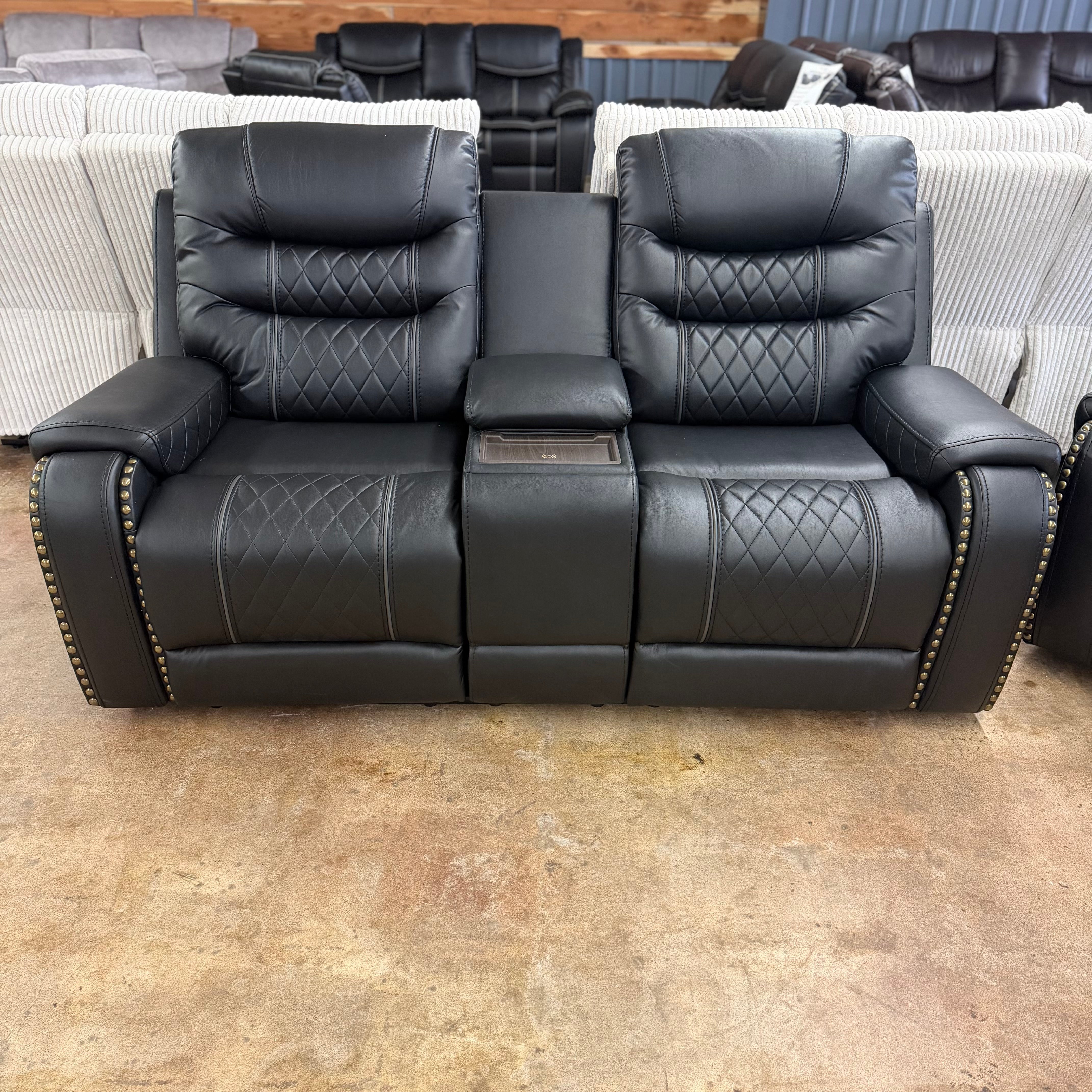 This Starwood Reclining Loveseat is upholstered in a beautiful black leather air match material (breathable 100% polyurethane with the feel and appearance of leather-like). The loveseat has console cupholders w/ wireless charger with recliners. A matching reclining sofa and rocker recliner is available.