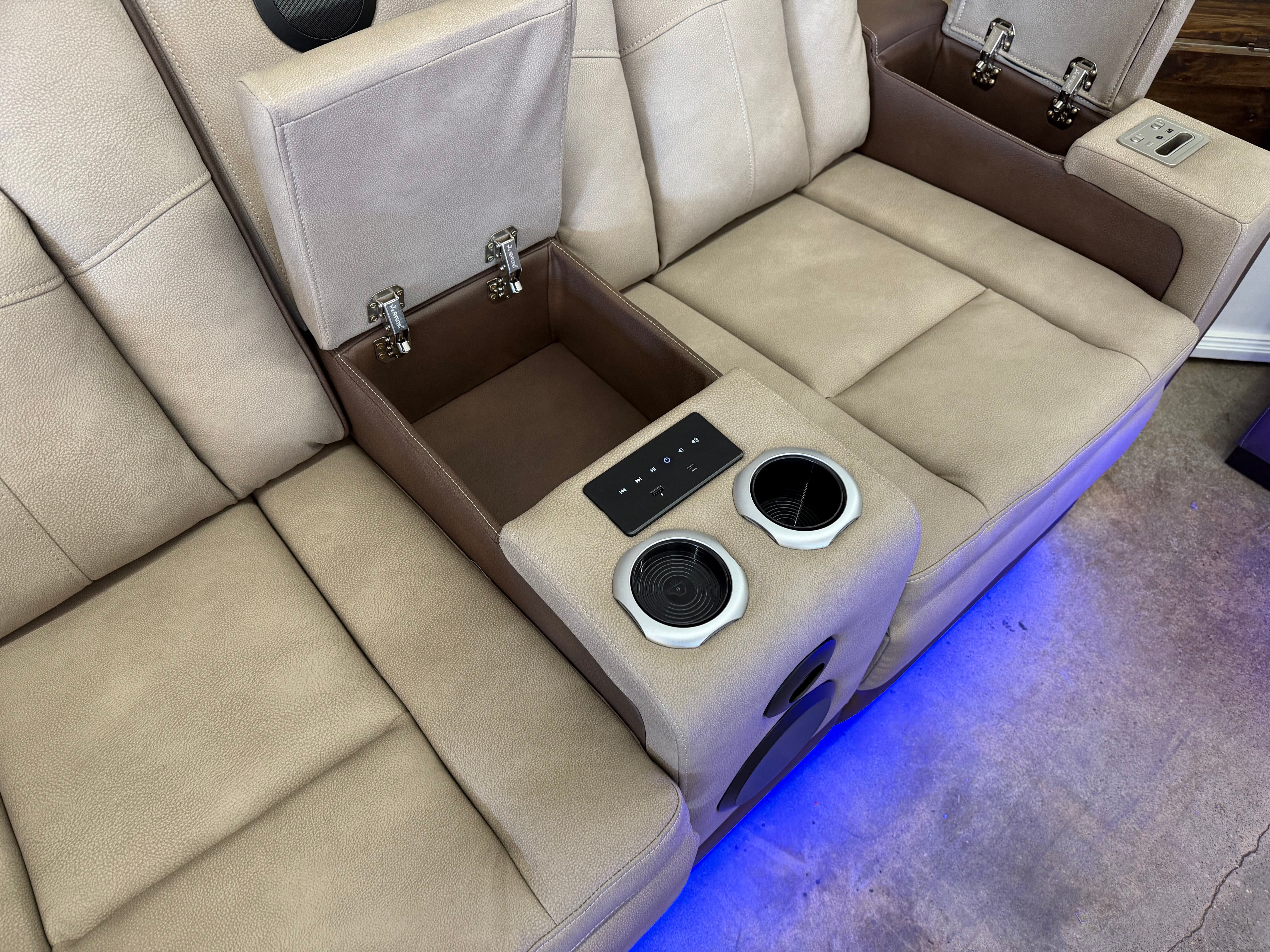 - Sofa Drop-down table with LED reading lights, dual cup holders, 2 electrical outlets and USB and wireless charging