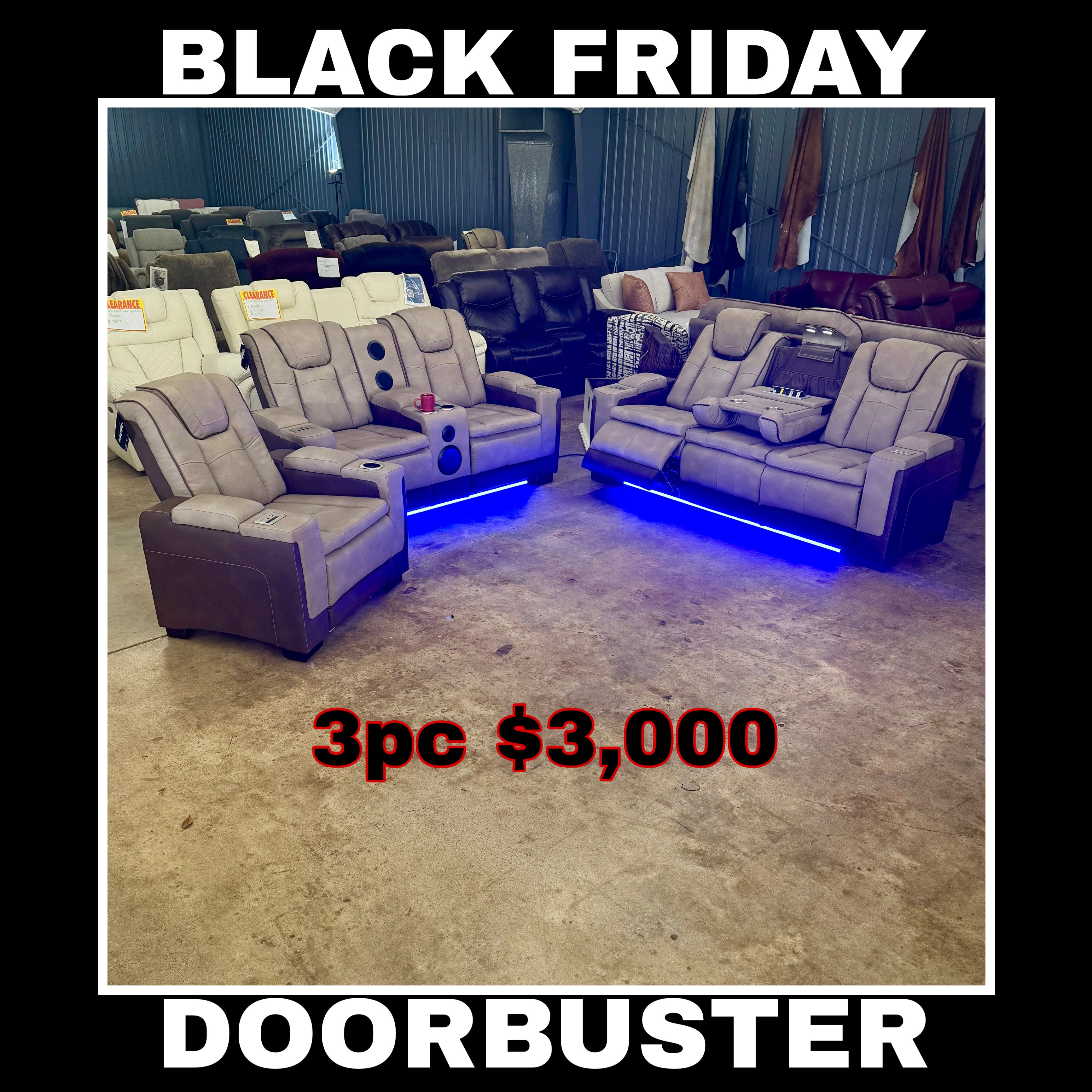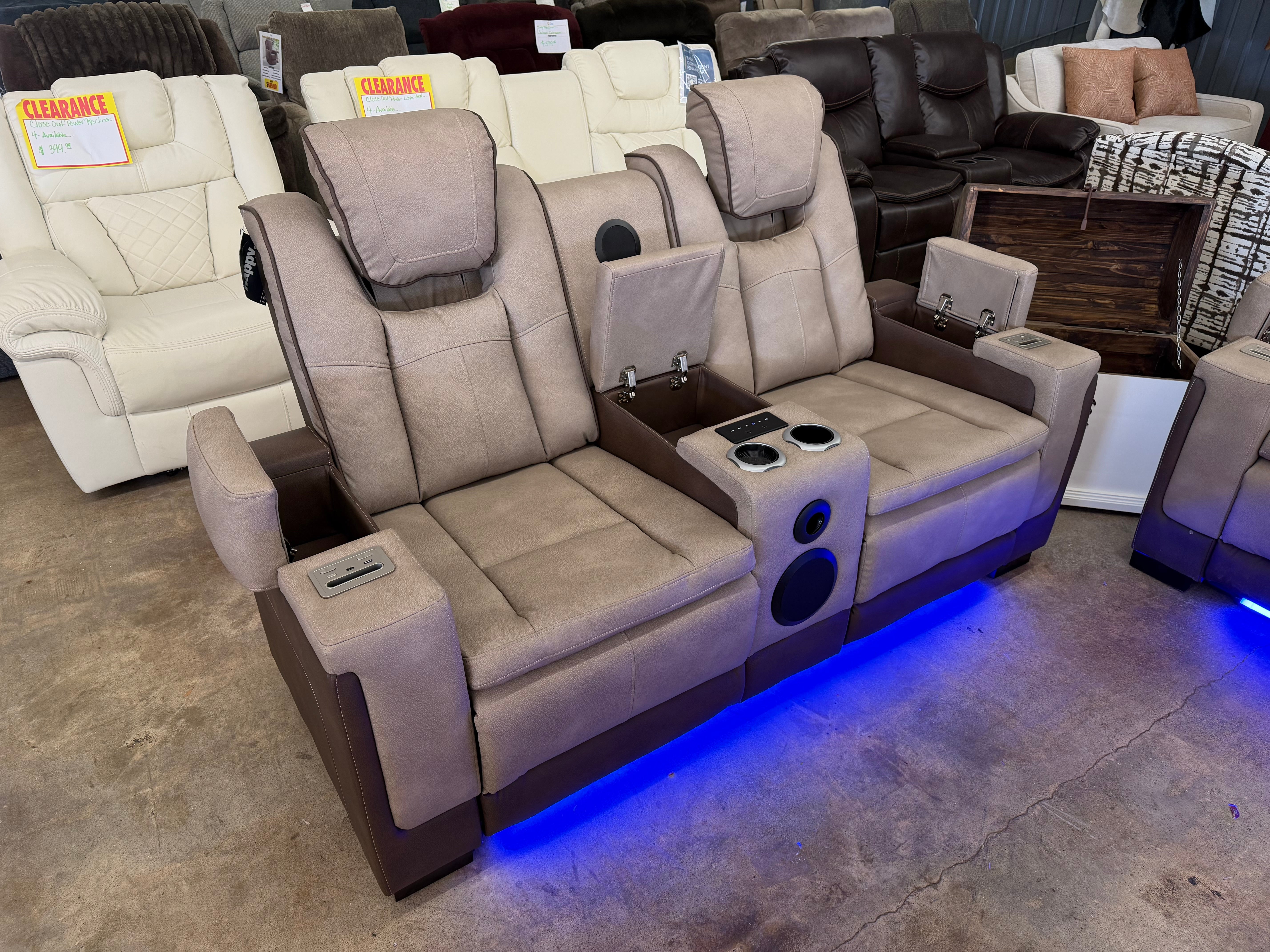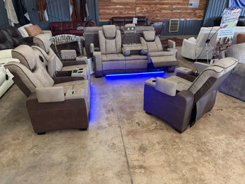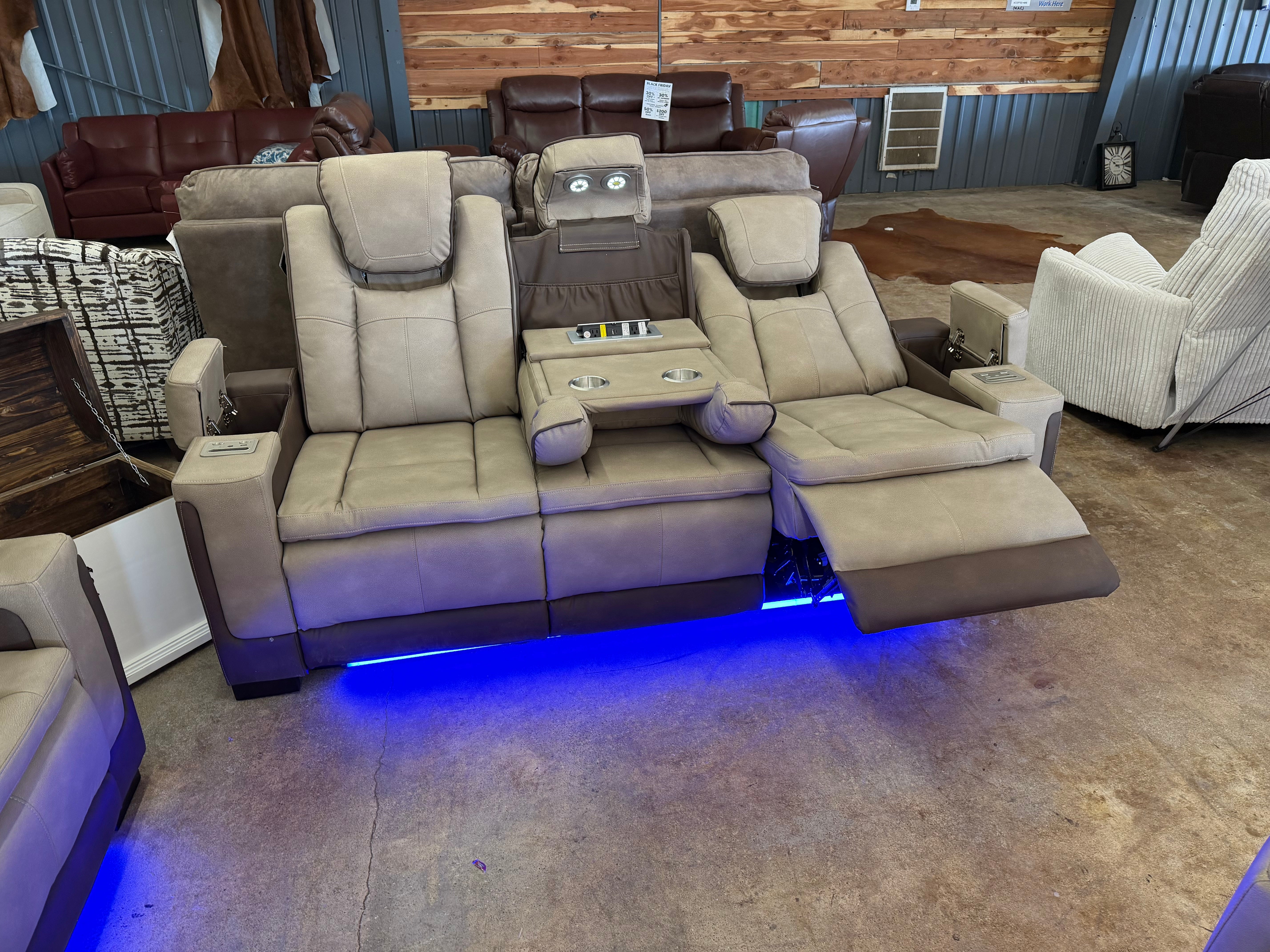 Upgrade your living room with the Rodeo Brown Power Reclining Set. Made of leather gel material, this set offers a comfortable and stylish seating experience. With power footrest and headrest, you can fully relax and unwind. Plus, the LED lighting adds a touch of modern elegance to your space. Elevate your living room game now!