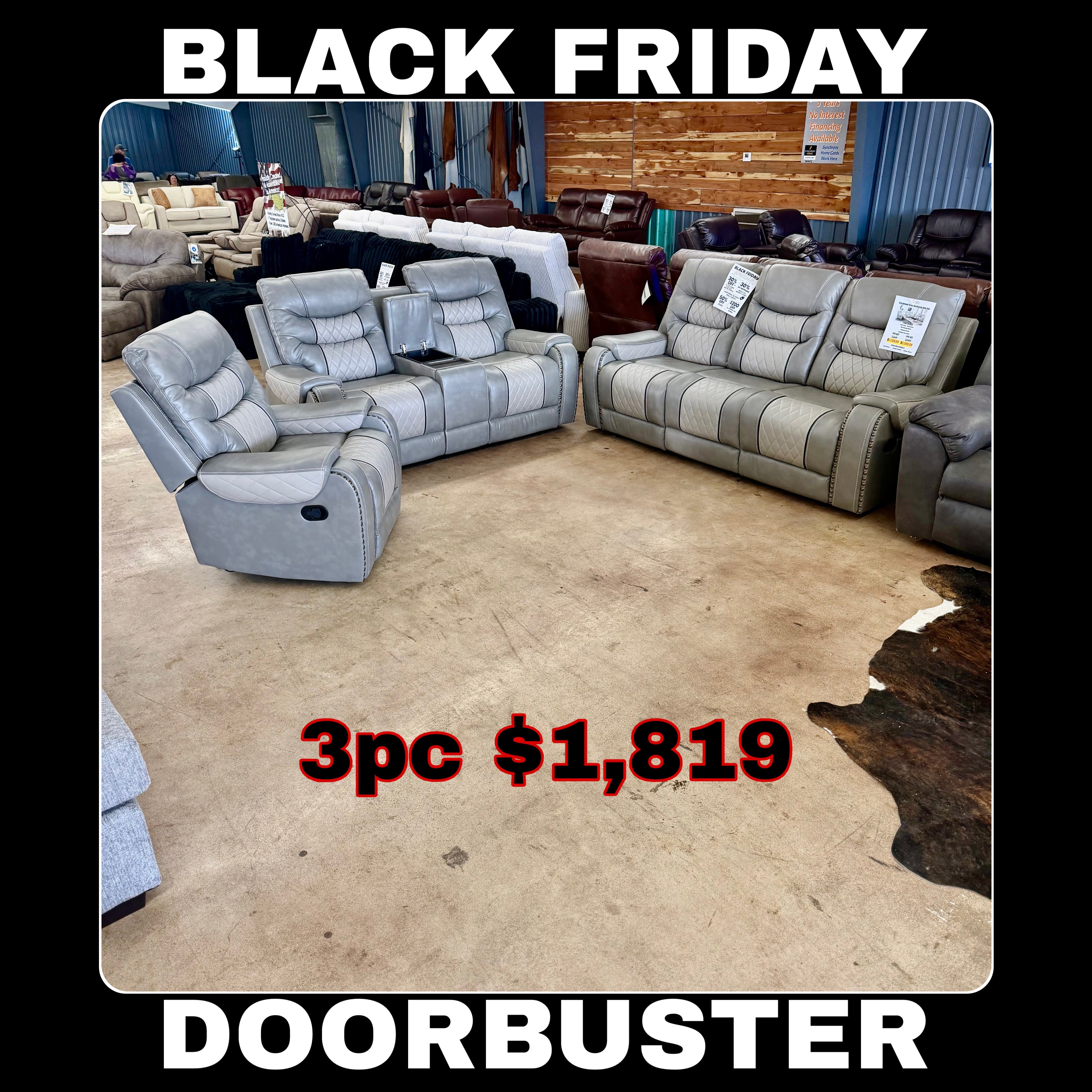 This Starwood Reclining Set is upholstered in a beautiful two-tone grey air leather material (breathable with the feel durability and appearance of leather-like). The sofa has a drop-down tray w/ wireless charger with recliners. The loveseat has console cupholders w/ wireless charger with recliners.